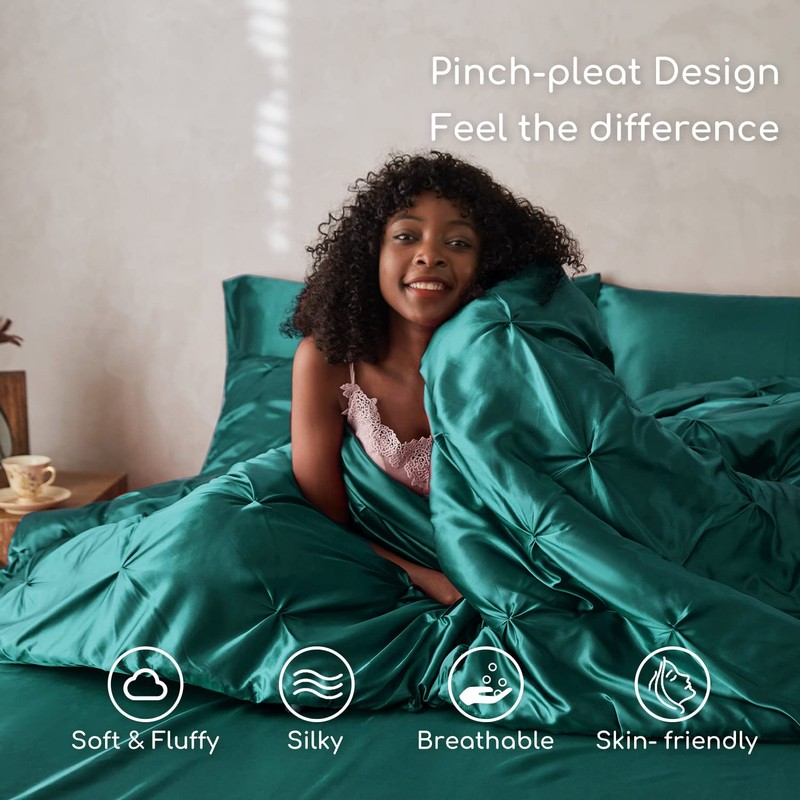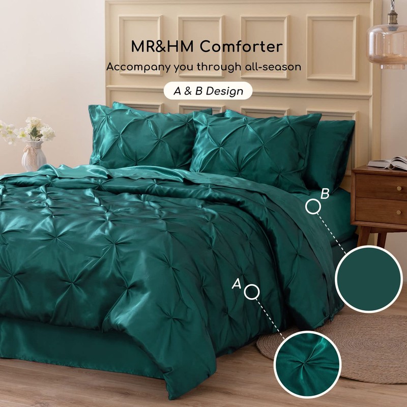 MR&HM Satin Comforter Twin 5 Pieces - Luxurious Pinch Pleat Bedding Set with Comforter, Flat Sheet, Fitted Sheet, Pillowcase & Sham, Super Silky Soft Bed Set for All Season (Twin, Peacock Green)