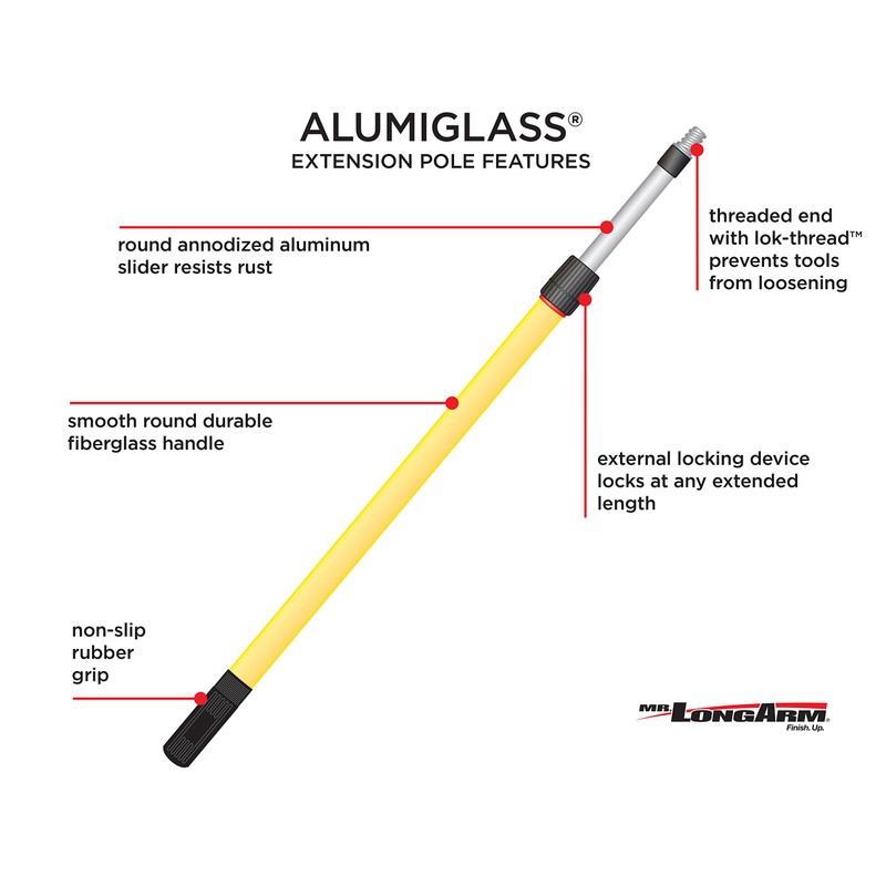 The Mr. Longarm heavy duty extension pole allows you to attach a paint brush or other tool so that you can work in hard-to-reach areas. It features a combination fiberglass exterior handle with an aluminum interior slider tube. Easily extends in length with just a twist of the external locking cam. 6 feet to 12 feet extension.