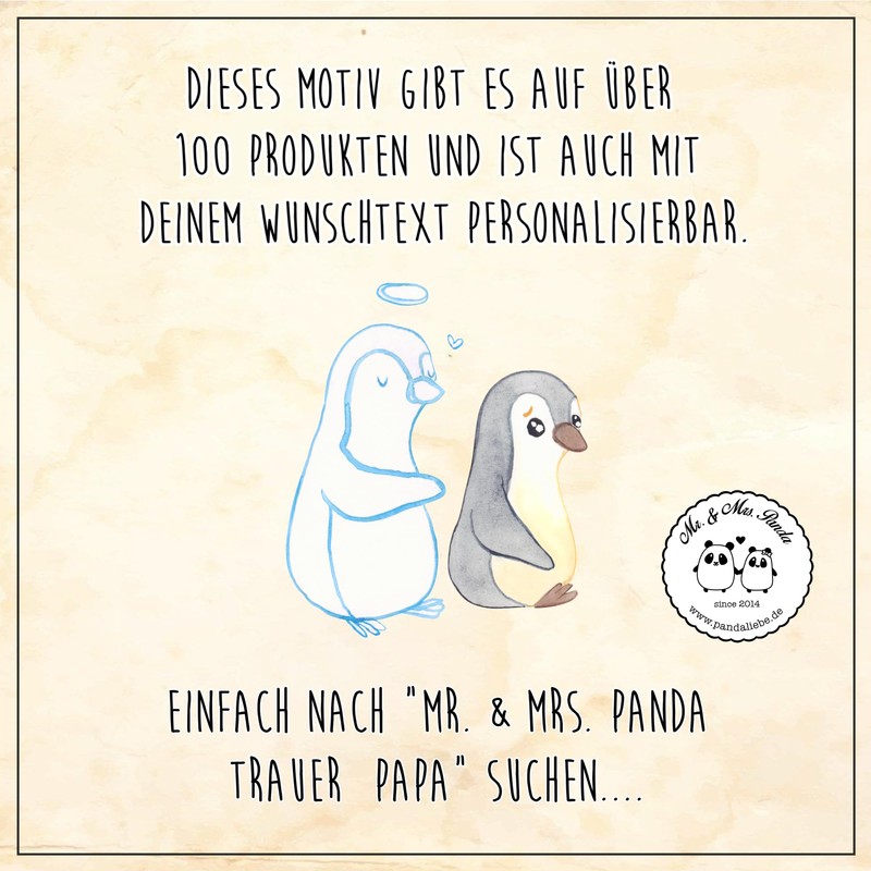 The motif 'Trauer Papa' conveys the deep pain and at the same time the comfort of the memories. The little penguin, bent with grief, finds shelter in his father's cloud that gently envelops him and shows his love.