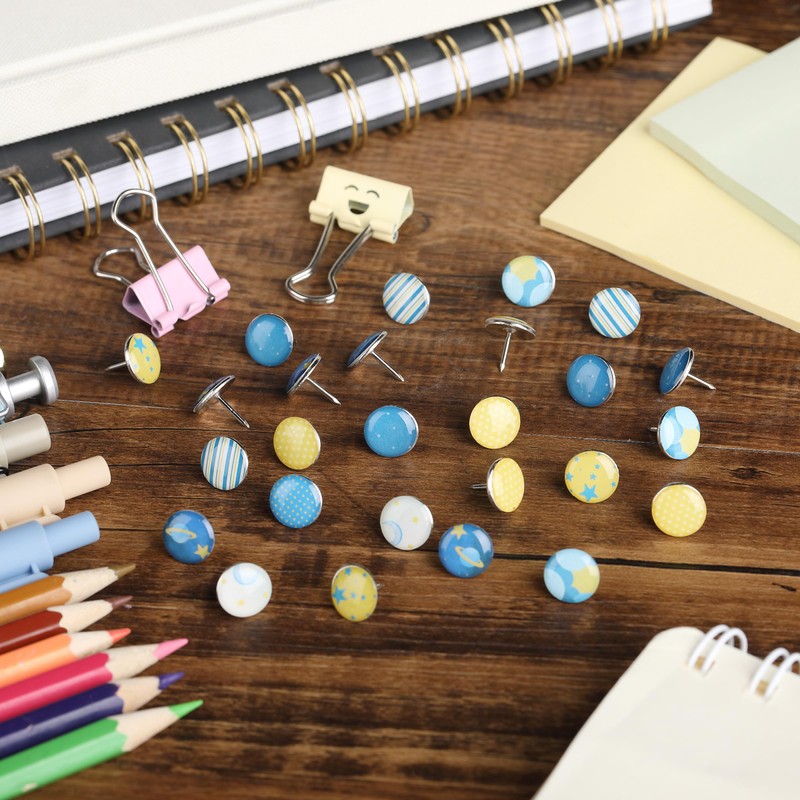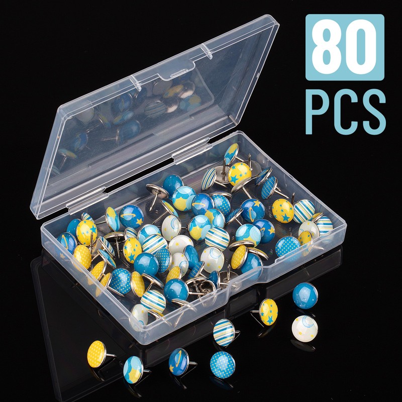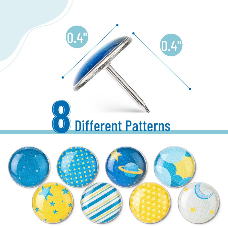 - Mr. Pen decorative push pins come in a pack of 80, featuring fun and colorful designs in shades of blue and yellow with patterns like stars, planets, and stripes.