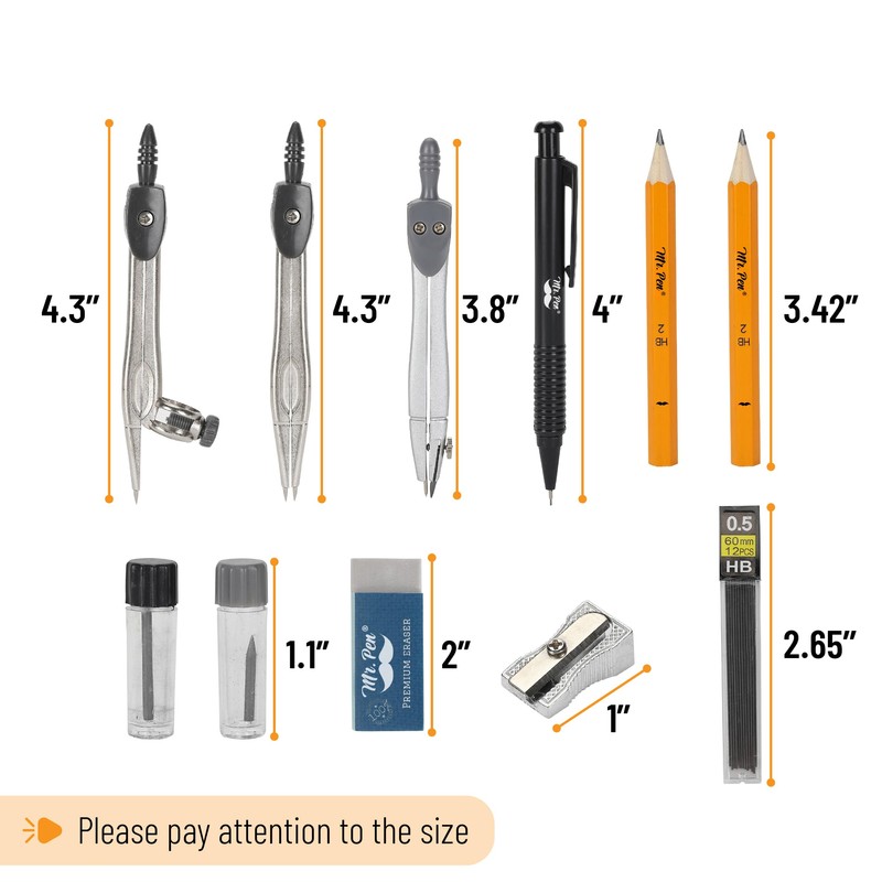 - Package Includes 15 Piece: 2 Metal Compasses (1 Study Compass & 1 Graphic Compass), 1 Extra Lead for Graphic Compass, 1 Metal Divider, 2 Pencils for Compass, 1 Mechanical Pencil (0.5 mm) for Compass, 1 Pack of 0.5 mm Lead for Mechanical Pencil, 1 Eraser, 1 Metal Pencil Sharpener, 1 Ruler (6”), 1 Set Square (30°/60°), 1 Set Square (45°), 1 Protractor, 1 Protractor with Swing Arm (6”)