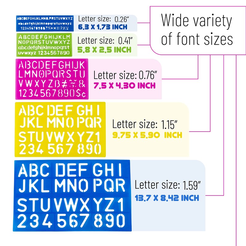 • 5 Pc Alphabet Template: Sturdy, Flexible And Durable With Raised Ribs To Prevent Smudging Stenciling Guide Contains A-Z, A-Z, 0-9 And Other Punctuation Symbols A-Z Letter Sizes From: From 1/4 Inch To 1-9/16 Inch a-z Letter Sizes From: From 1/4 Inch To 7/16 Inch Numbers And Other Symbol Sizes: From 1/4 Inch To 1-9/16 Inch