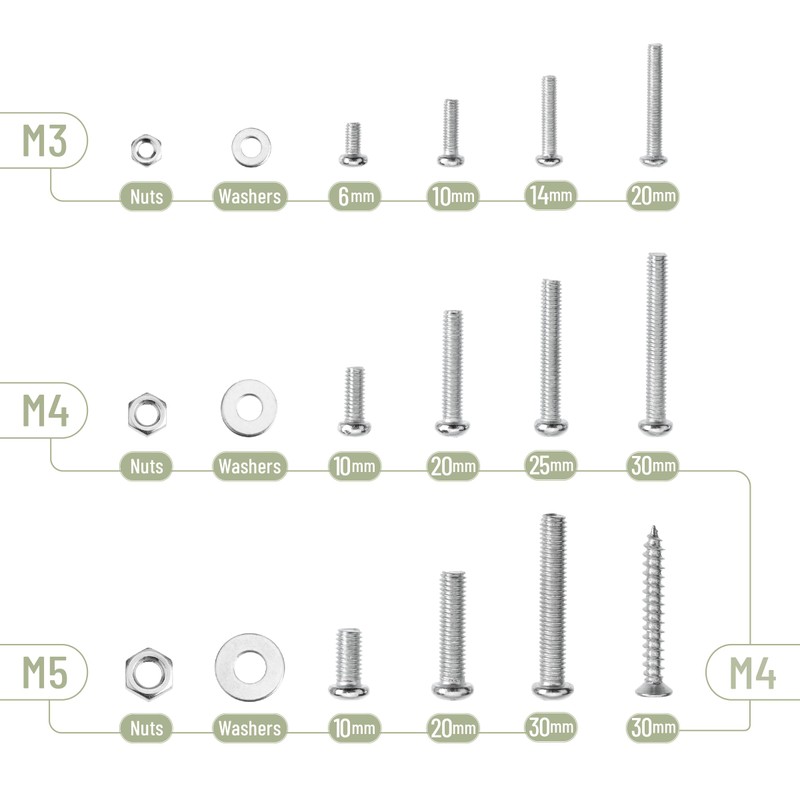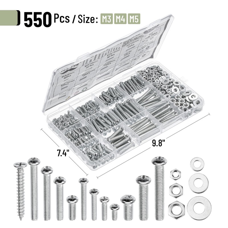 - Mr. Pen nuts and bolts assortment kit includes 550 pieces, featuring a variety of M3, M4, and M5 Phillips pan head screws, nuts, and flat washers, offering a complete solution for your fastening needs.
