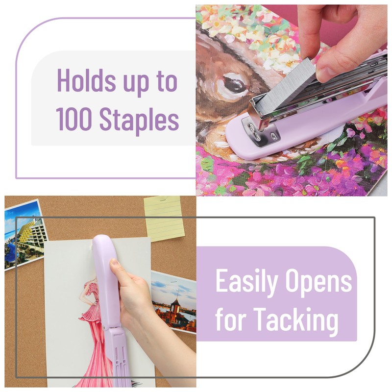 • Package includes 2 full strip purple staplers along with 200 staples, providing everything you need for your stapling tasks.