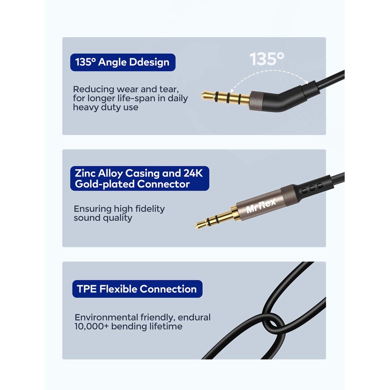 - copper and 24K gold-plate connector, ensuring high fidelity sound quality and providing maximum's durability.135 degree anglereducing tear and wore-special degree design, metal connector and dual-layer connector cover for longer life-span in daily heavy duty use.