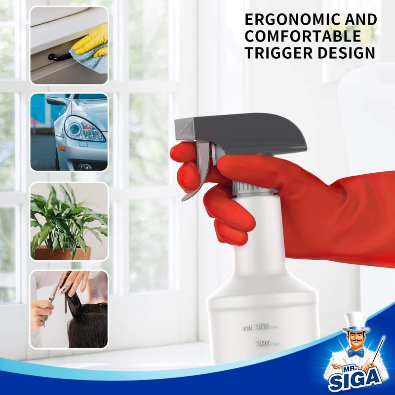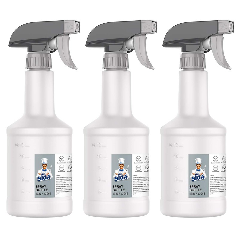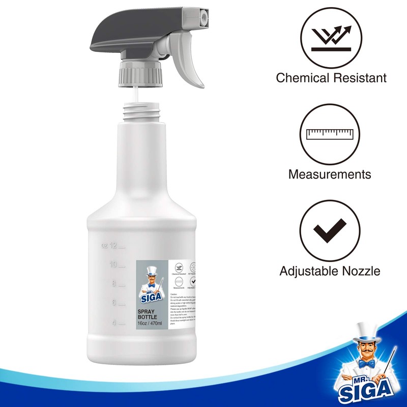 UPGRADED SPRAY HEAD & LEAKPROOF: Made from durable HDPE which is heavy duty and chemical resistant, great for household and commercial tasks. Upgraded spray head effectively provides a leak & clog-free experience which also stands for more than 50 thousands spray test. ERGONOMIC TRIGGER DESIGN: Ergonomic neck of the spay bottle fits comfortably in your hand, enabling long time spay job without hand fatigue. Adjustable nozzle can be switched easily from fine mist, solid stream or to off with just a simple turn to suit your needs. Our spray bottle comes with extra-long suction dip tube which reaches the bottom of the bottle and enables you to get the last of your liquid sprayed out. REUSABLE & LONG LASTING: Our spray bottle is manufactured with premium quality, it is durable, hygienic, non-toxic and reusable. Features measurements on the bottle which make it easier to see how much contents remain inside. The 16 oz capacity holds enough liquid to complete your job without carrying around a larger heavier bottle. Mark on the label of spray bottle to distinguish different liquid. MULTI-PURPOSE: Spray bottle can be used at a wide range of common cleaning for kitchen, bathroom, car or commercial, industrial cleaning, such as window cleaning, floor cleaning, misting and watering plant car detailing and more. MR.SIGA's mission: Make your housework easier, and make the world cleaner. If you’re not happy about the product, you’re covered by a full refund. Please do not hesitate to contact us with any questions you may have, we are here for support and advice!