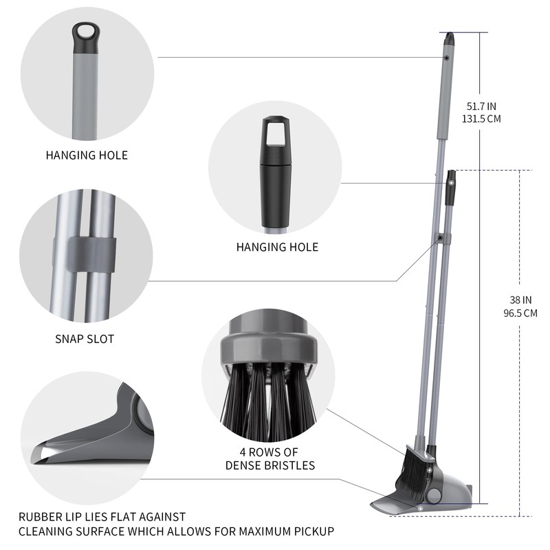- 51.7 inches of long broom handle provides a easy cleaning of hard to reach places so it saves your back and knee. You can adjust the pole length to accommodate different cleaning jobs. Foam wrapped handle top fits comfortably and perfectly in hand, which offers a comfortable pickup and hold while sweeping.
