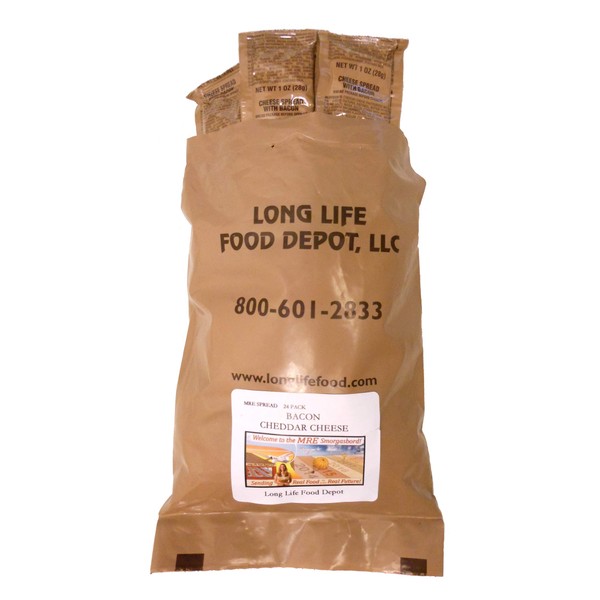 - 24/1.0 oz pouches of MRE Bacon Cheddar Cheese Spread, Sealed in Sand Colored Poly Bag. Latest Available Manufacture Dates.