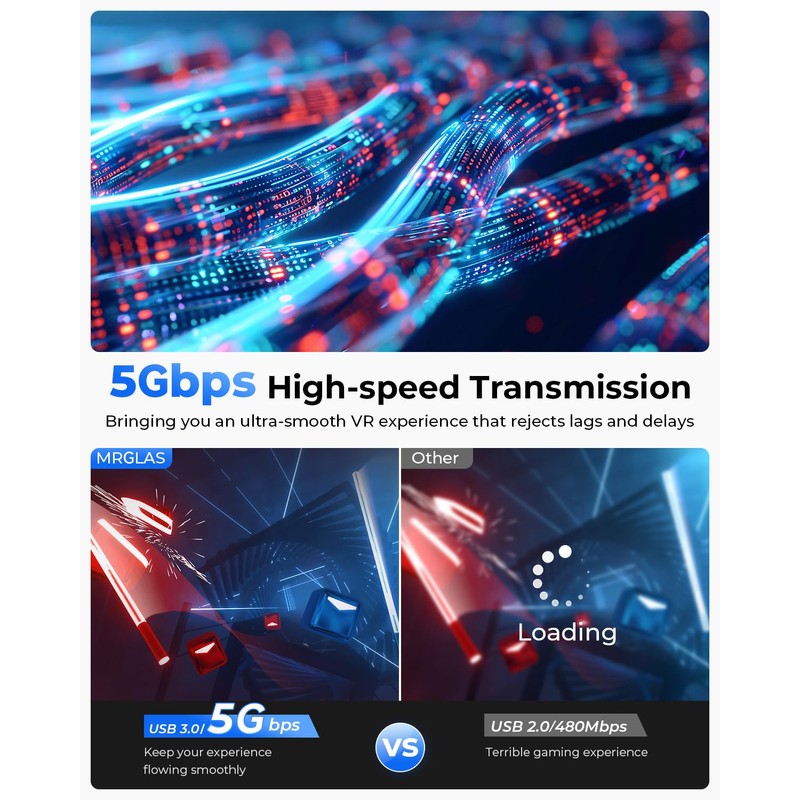 - Upgraded Gold Plating: MRGLAS is designed with gold-plated connectors and multi-layer shielding structure to minimize signal interference, allowing your VR equipment to transmit data with zero latency and more stability. Meanwhile, it effectively avoids the energy loss of other cables, and the gold-plated plug prevents rust and corrosion, and lasts 3 times longer than other cables.