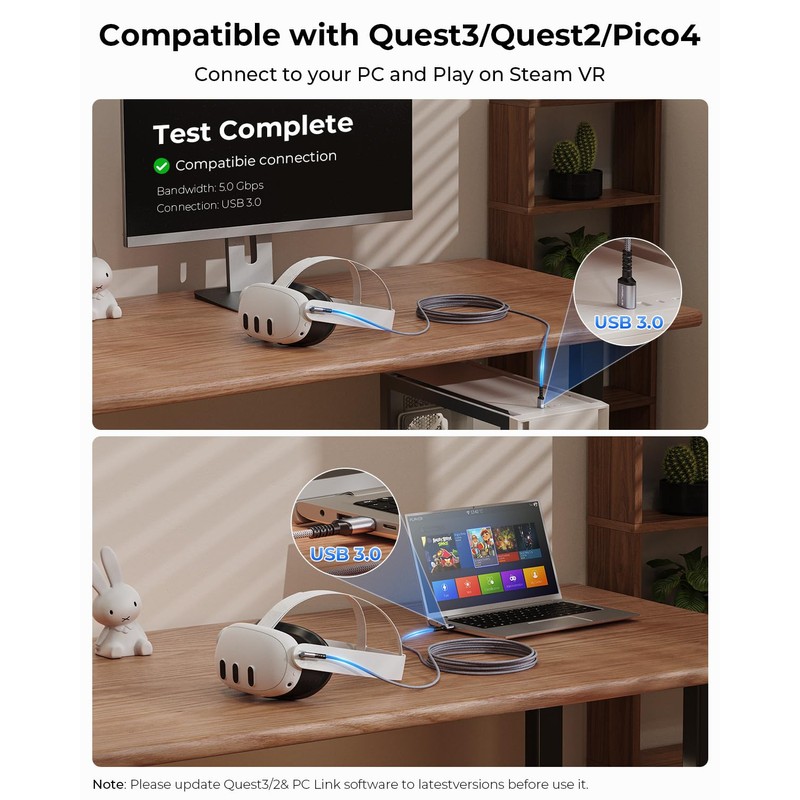 - 5Gbps High-speed Transfer: This cable supports USB 3.0 transfer speed without delay, stable and fast data synchronization and continuously reliable current bring you a smooth gaming experience. As a reminder, the charging current will decrease as the cable length increases, so we do not recommend using this cable to charge your Quest2/Pro/Pico4. Additionally, to enhance your VR experience, we do not recommend using this cable when the headset is at a low battery level.