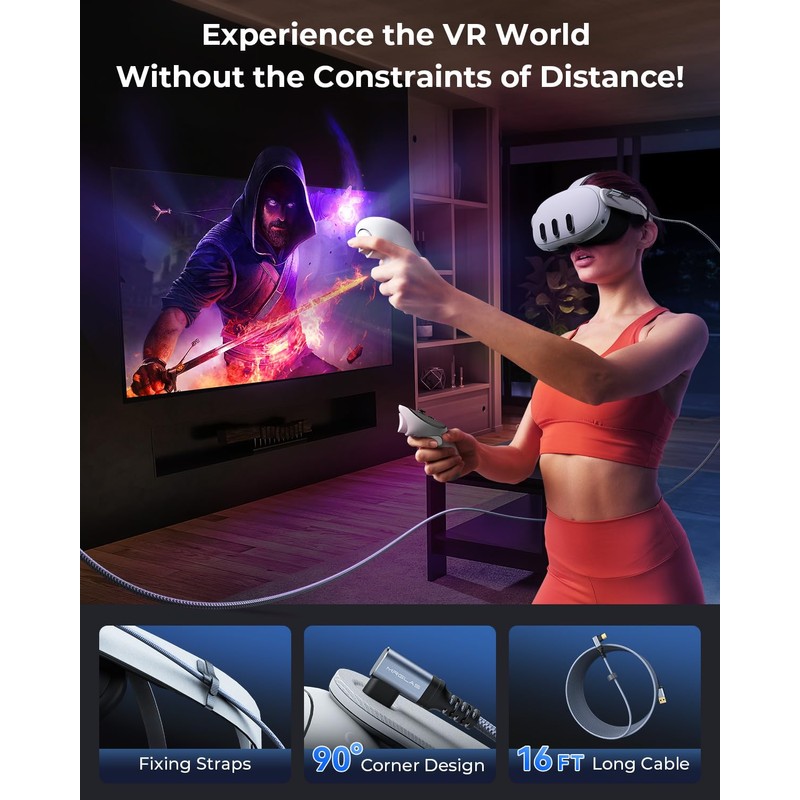 - 16FT/5M for Wider Range of Motion: With up to 16 feet/5 meters of cable and abrasion-resistant nylon braided fibers, there is no longer any worry about your freedom of movement or damage from being stepped on, providing plenty of space and freedom of movement while enjoying VR.