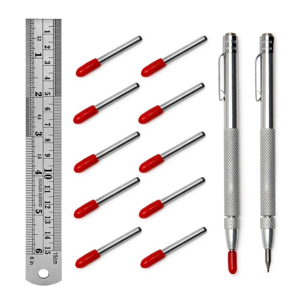 Mriuuod 2 Pack Tungsten Carbide Scriber Tool with Magnet, with Extra 10 Replacement Marking Tip And 6-Inch/15cm Stainless Steel Ruler, Etching Engraving Pen for Glass Ceramics Metal Sheet