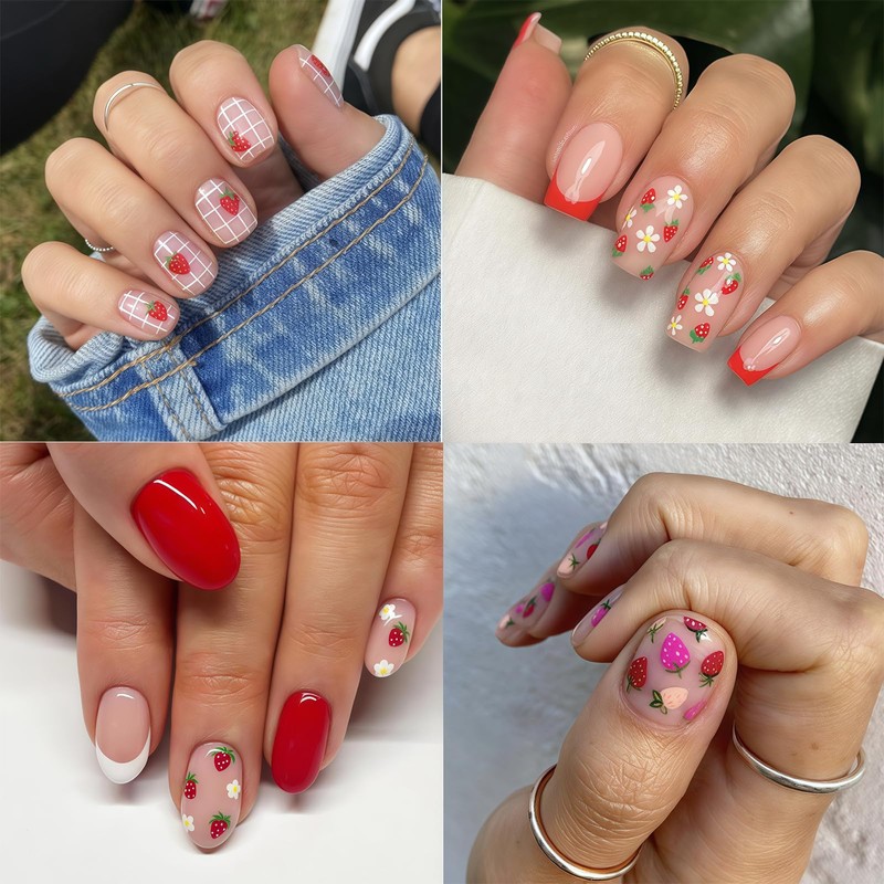 Mrltau 96 Pcs Cute Fingernägel zum Aufkleben Kinder Mädchen, Süße Künstliche Nägel zum Aufkleben, Erdbeer Design, Kurz Fake Nails, Press on Nails for Kids, Künstliche Fingernägel Geschenk