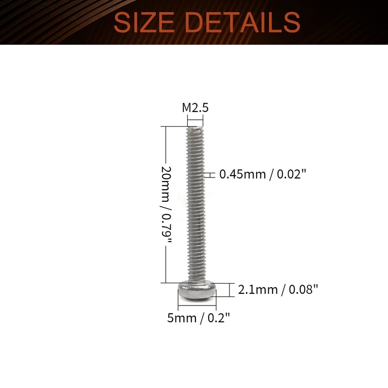 • Model:M2.5*20mm; Material:304 Stainless Steel;Screw Length:20mm;Pitch:0.45mm;Screw Head Diameter:5mm;Screw Groove Type:Phillips