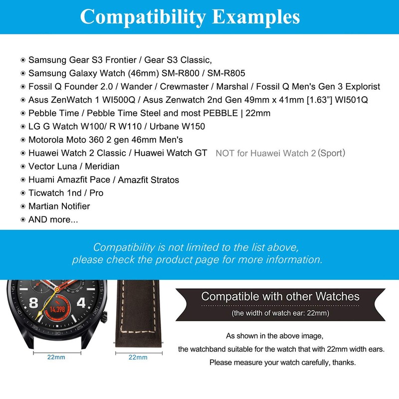 - Wide compatibility: Gear S3 Frontier strap also perfect for Samsung Gear S3 Classic, Galaxy Watch 46 mm (SM-R800 / SM-R805), Moto 360 2nd 46 mm, Pebble Time/Pebble Time Steel, LG G Watch/R/Urbane, Asus ZenWatch 1 WI500Q/ ZenWatch 2nd Gen [1.63 inch], Fossil Q Founder 2.0/wall er/Crewmaster/Nate/ Marshal/ Fossil Q Men's Gen 3 Explorist, Amazfit Pace/ Stratos, Ticwatch 1nd/ Pro, Huawei Watch 2 Classic/ Huawei Watch GT Smartwatch, Martian Notifier, Vector Luna/ Meridian and other 22 mm watches.