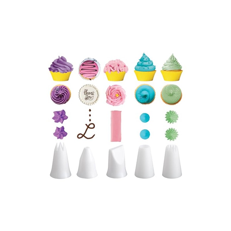 - Includes 5 reusable decorating tips (1 each open star, closed star, petal tip, writing tip, open round); each tip measures 1.5 x 1-inches