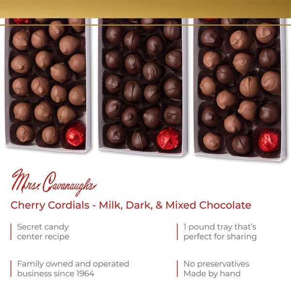 - CHOCOLATE COVERED CHERRY CORDIALS: The best cherry cordial in the world! We use only premium, fresh cherries. The cherry is coated with our secret candy center recipe and then smothered in a rich layer of premium milk or dark chocolate. These big candied cherries arrive in a tray that’s perfect for gifting. Mrs. Cavanaugh's cherry cordials include approximately 22 delicious pieces per pound.