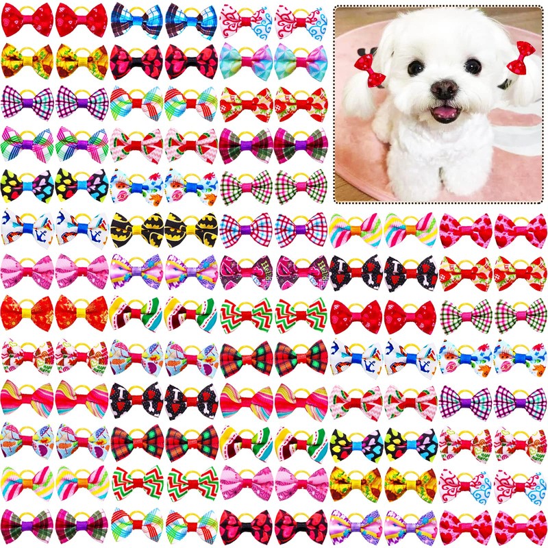 Mruq pet 100pcs Pet Dog Bows, Bulk Dog Hair Accessories Bows with Rubber Bands 1.37x0.98 inch, Handmade Yorkie Dog Hair Grooming Small Size Bows, Mix Puppy Dog Bowknot for Small Dogs Cats