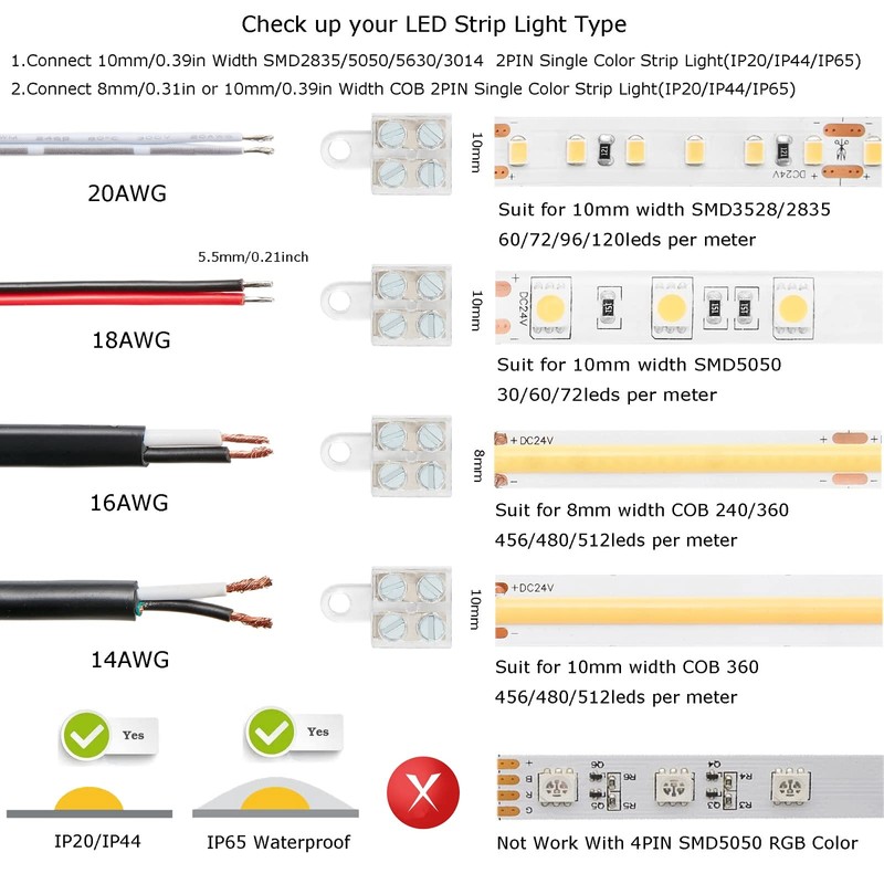 Only suit for 10mm width SMD2835/5050/3014/5060 led strip light and 8mm/10mm width COB led strip light.