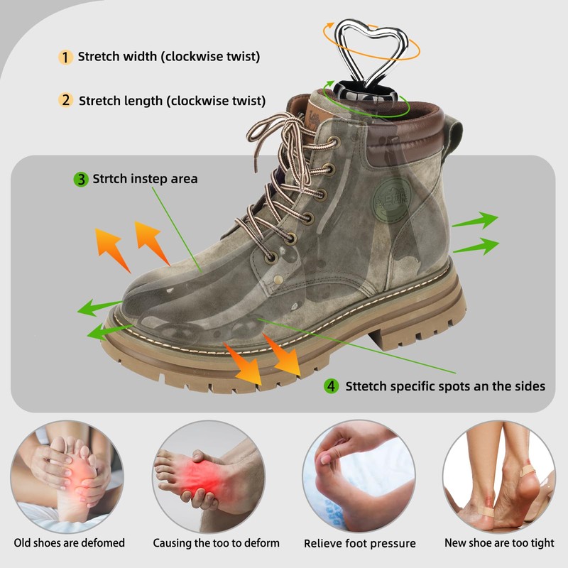 - Shoe Stretchers Provide 5-Way Stretching: Stretch width to widen shoe; Stretch length to increase shoe size; Expand bunion areas; Raise shoe instep or vamp. Being applied with shoe extender, let the shoe roomy and comfortable.The shoe enlarger will save your wide feet many blisters and pains. This shoe stretching tool can also be used as shoe shaper and shoe keeper to maintain shoes in a good shape