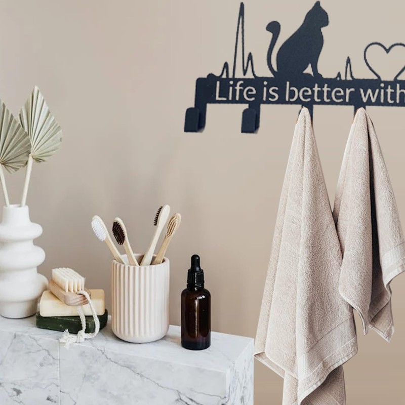 - - [Durable and Stylish Design] Made of high-quality iron material with a black matte finish, this 9.8-inch key holder is rustproof, waterproof, and stain-proof. The sleek "Life is btter with cat" design adds a modern touch to your entryway.cat key holder wall mount