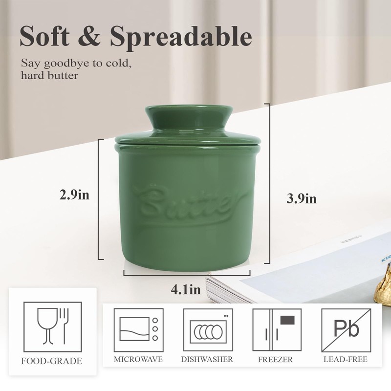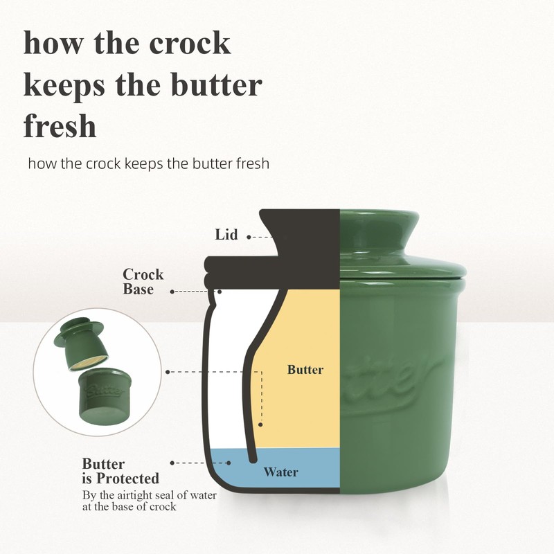 - GETTING RID OF EATING COLD BUTTER: If you love the soft taste of butter, hate hard and cold butter, and hate butter with a refrigerator smell. Don't miss this butter crock. This butter crock creates a sealed environment using water, keeping your butter fresh and flavorful at room temperature (up to 24°C, 75°F) for up to 10 days, without the need for refrigeration.