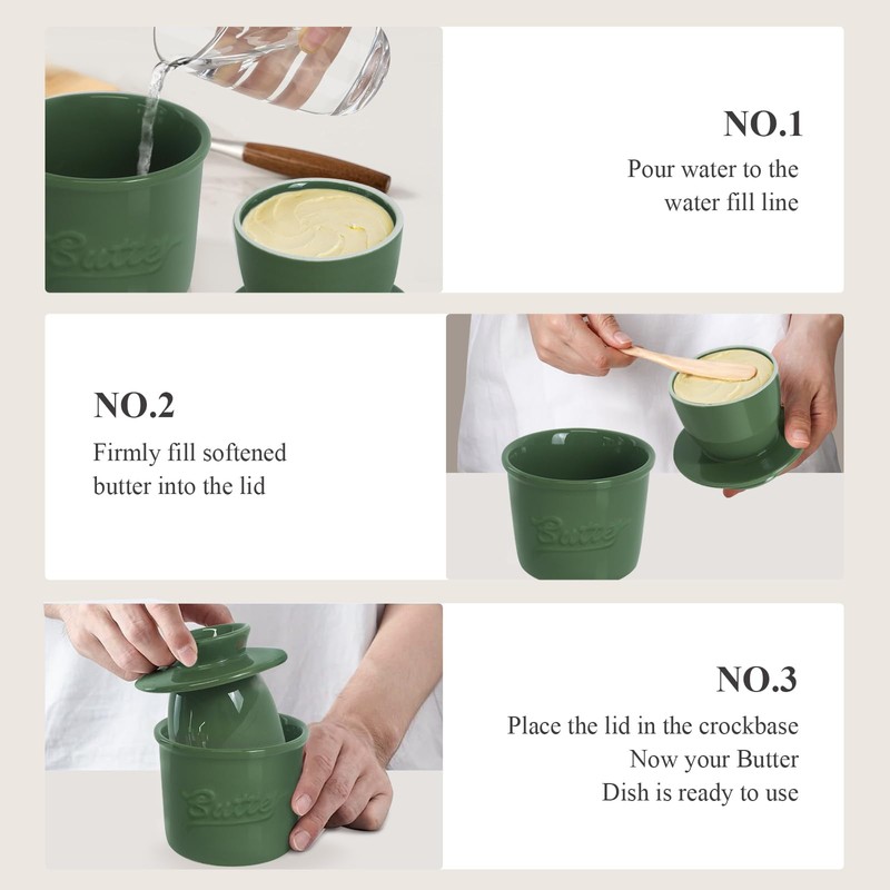 - EASY TO USE: 1.Make sure the butter crock is clean and dry before use 2.Avoid using overly soft butter. Fill the lid with butter and press gently with a butter knife or spoon. Plesase Note: To keep the butter fresh, replace the water in the butter crock every 2-3 days.