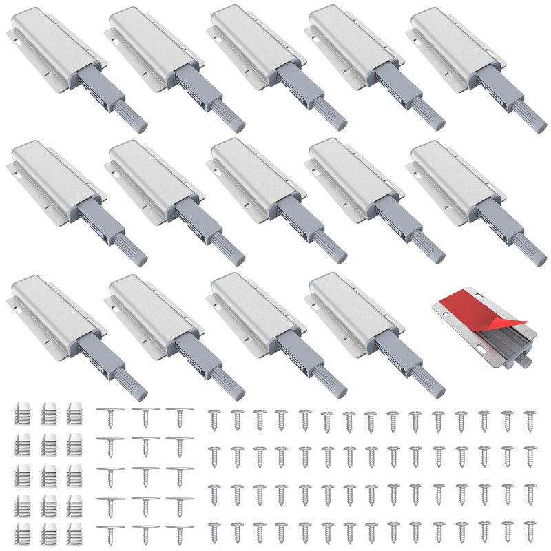• What Your Get: 15 cabinet push latches; 60 base mounting screws; 15 flat head screws; 15 anchor bolts; 15 adhesives;