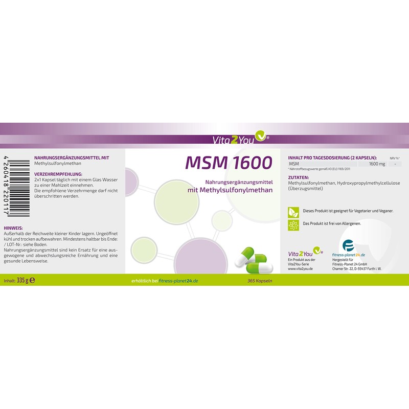 - ► VITA2YOU: Our MSM from Vita2You delivers high 1600mg methylsulfonylmethane in just two capsules daily and 800mg per capsule.