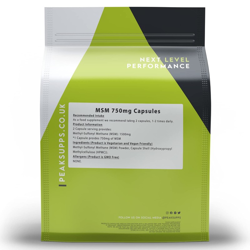 Methyl-Sulfonyl Methane, commonly known as MSM is a form of sulphur and the fourth most abundant mineral in the human body. Peak Supps MSM tablets are one of the highest strengths available in HPMC capsule form at 750mg per capsule. It can be naturally found within plants, humans (in fluid around the joints) and animals. Peak Supps 750mg MSM capsules are an ideal way to increase your intake of MSM.