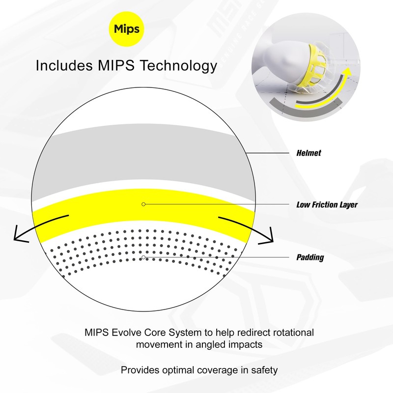 - Durable and lightweight polymer shell. MIPS Evolve Core system to help redirect rotational movement in angled impacts.