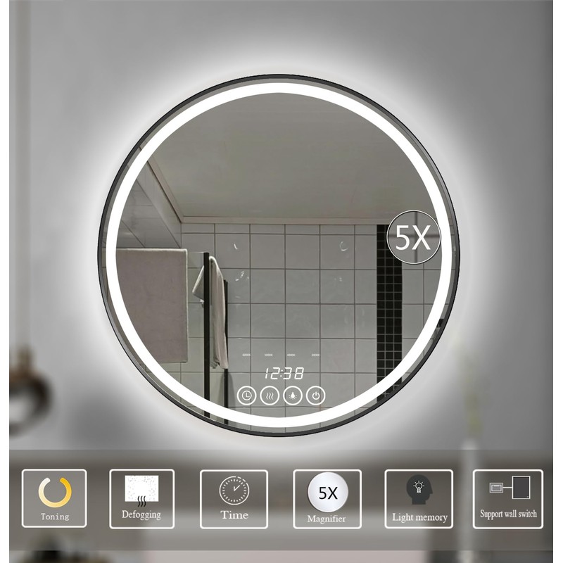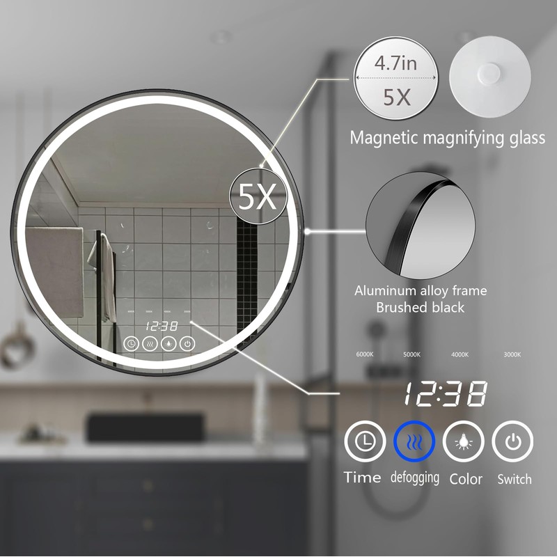 Touch Switch + Anti Fog + 12 hour clock + 5x magnetic magnifying glass + Dimmable Light + 3000-6000k color temperature