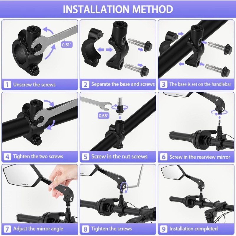 • 【Instalación Estable y Fácil】El espejo de carretera mejorado es firme y fácil de instalar. El chasis del espejo del manillar se fija con tornillos dobles, solo necesita usar la llave provista para colocar la base del espejo de la bicicleta en el manillar de la bicicleta y atornillar los tornillos para instalar de forma segura el espejo retrovisor en el manillar. Este proceso solo te cuesta unos minutos.