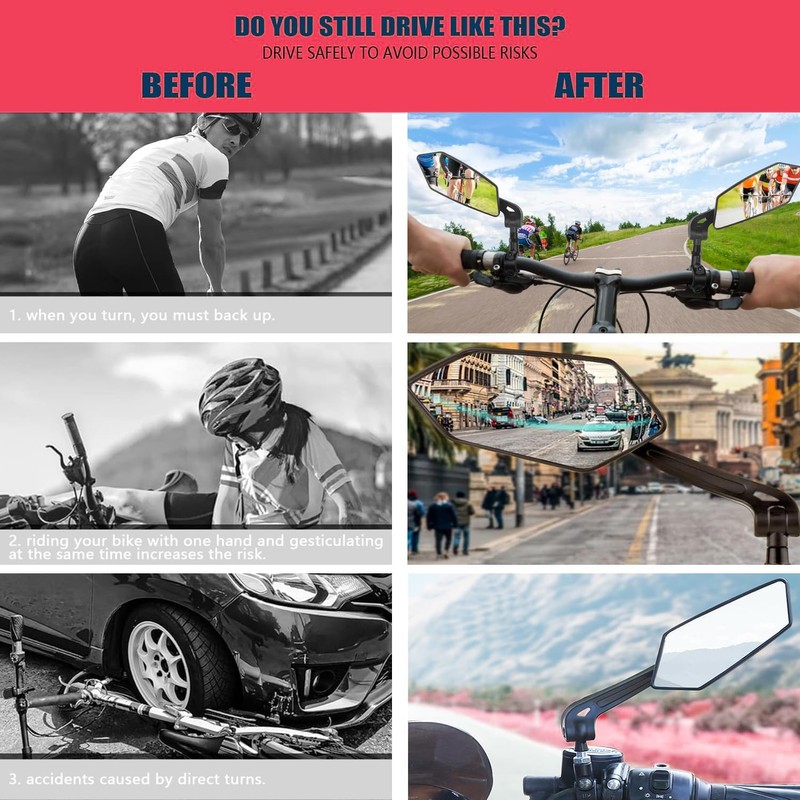 • 【Espejos Retrovisores Giratorios de 360 Grados】 El espejo del manillar de la bicicleta se puede girar de forma flexible 360°, puedes ajustar libremente el espejo de la bicicleta a un ángulo adecuado para obtener una mejor vista para ver las cosas desde diferentes direcciones, lo que puede evitar accidentes de tráfico. ocurrir y mejorar la seguridad del ciclista.