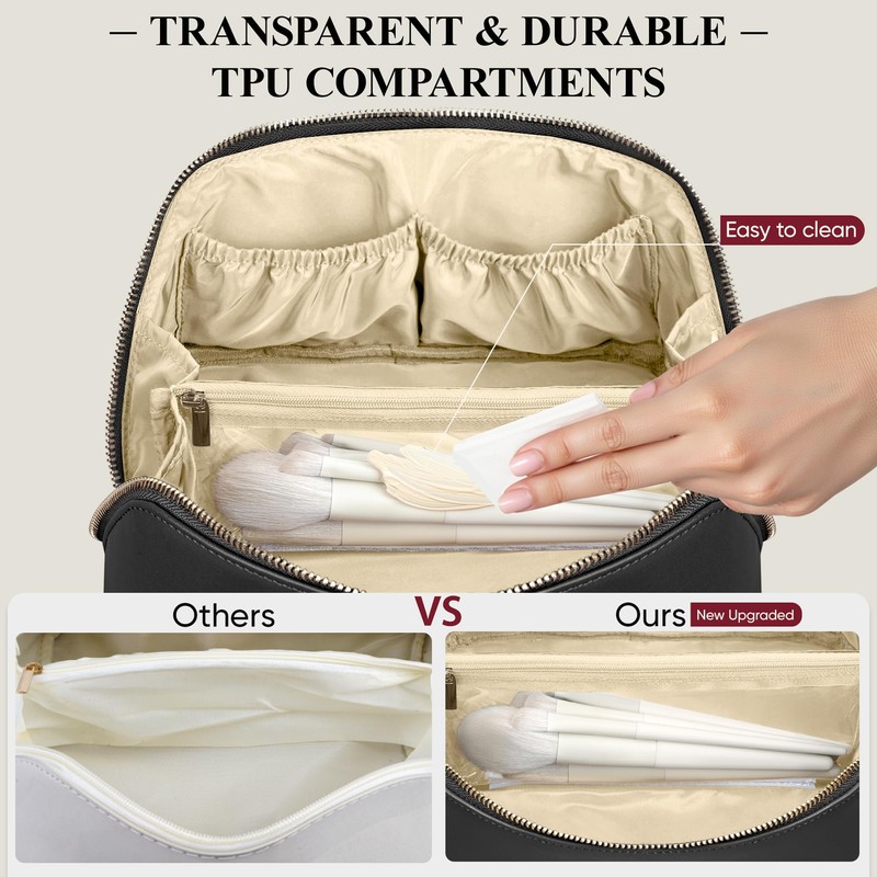 - 【Premium Material】Made of soft waterproof PU leather and wear-resistant nylon lining, stain-resistant and durable. With waterproof and transparent TPU makeup brush pocket inside, even if it is stained with foundation or eyeshadow, it can be easily wiped with a wet wipe and lasts as long as new.