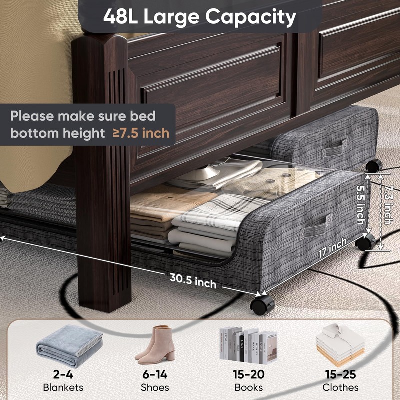 - 【XXL Large Capacity】Our under bed storage on wheels is made from durable Oxford material, a thick support base, and a sturdy metal frame, outperforming fragile metal meshes. It retains its shape under heavy items, preventing sinking. Measuring 30.5×17×7.3 inches (needs underbed height of ≥ 7.5 inches), it provides ample storage space for various items while fitting comfortably under most beds.