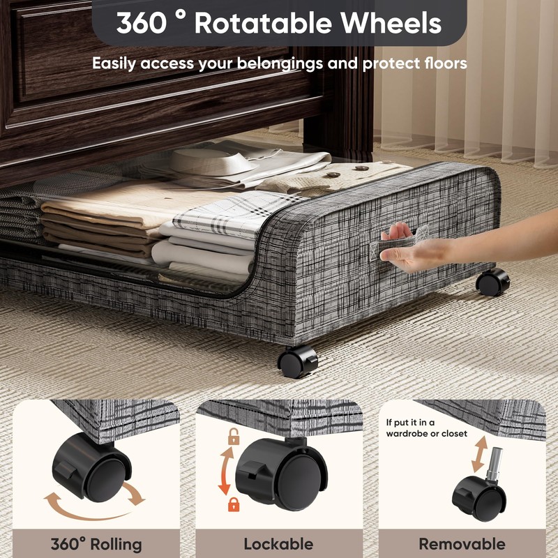 - 【Easy to Push and Pull】Our under-bed storage drawer features 4 x 360° rollers, 2 of which are lockable for stability when needed. It includes two durable 600D Oxford cloth handles on both sides, ensuring convenience and resistance to cracking. With the rollers, the drawer slides in and out effortlessly, reducing the need for arm strength when accessing the storage container.