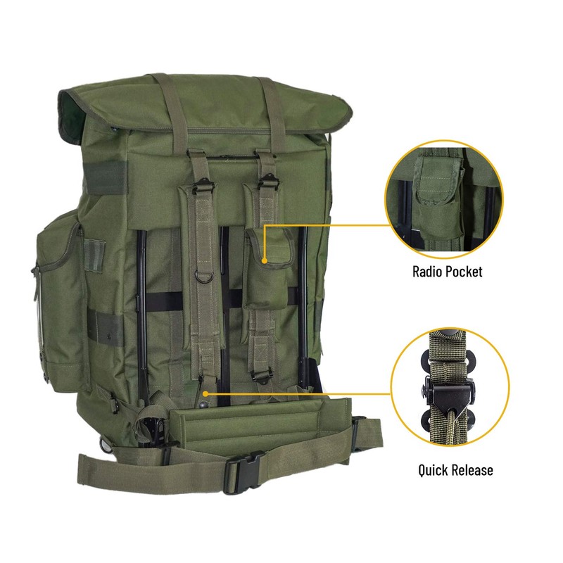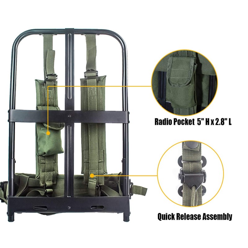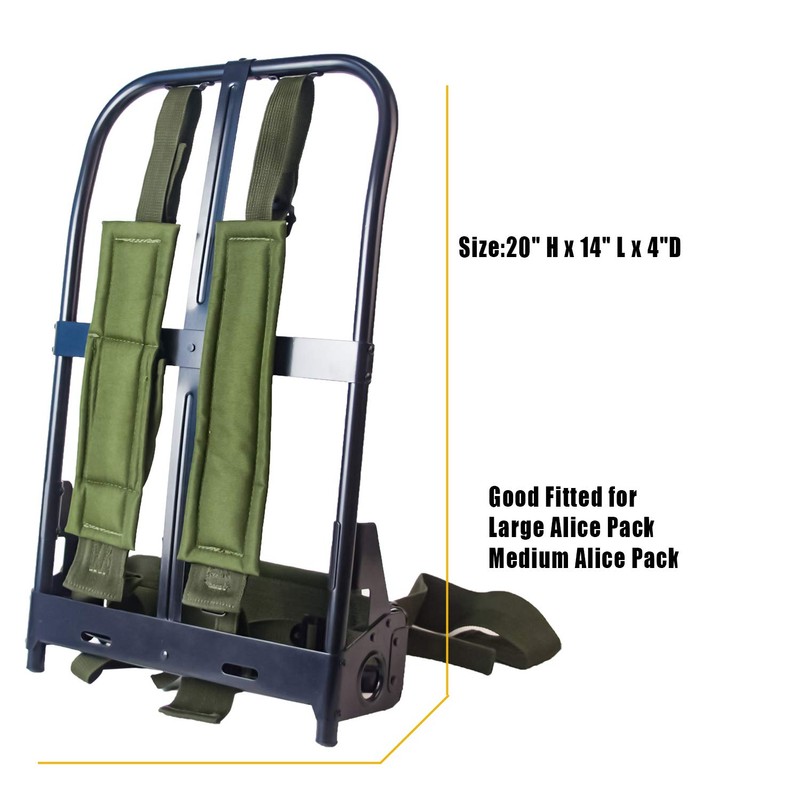 - ALICE Rucksack Universal Size System padded and easily adjustable shoulder Straps help relieve pressure, meanwhile the Kidney Pad strap on the frame also helps heave loading. Quick Release Buckle allows the whole pack to drop immediately while in emergency situation. Mixed Aluminum and Iron External Frame makes it lightweight but stronger.
