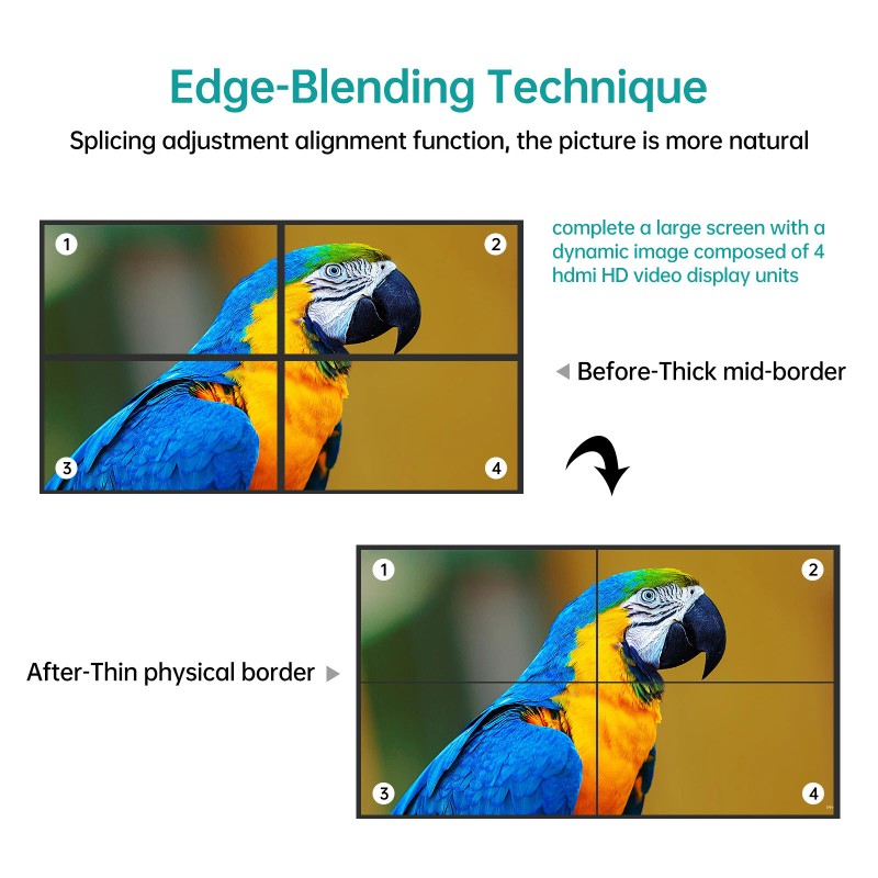 - 8 splicing modes can be changed at will:1X1,1x2,2x1,1x3,3X1,2X2,1X4,4X1, etc.The factory default setting is 2*2 splicing mode.