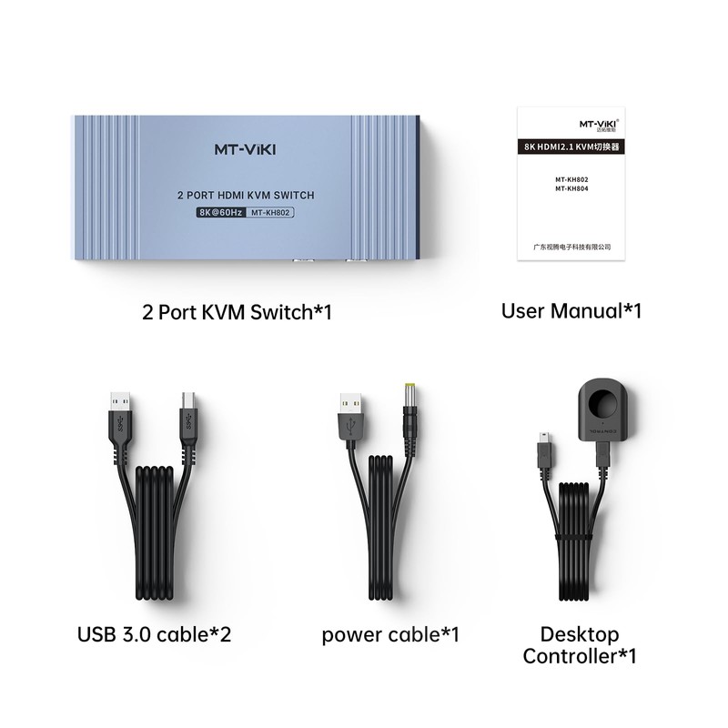 - Package List: 1* KVM Switch, 2* USB 3.0 Cables, 1* Desktop Controller, 1* User Guide, 1* Power Cable (Power adapter is not included, if power insufficient, pls plug in DC5V1A USB adapter); NOTE: 8K HDMI Cable is NOT INCLUDED