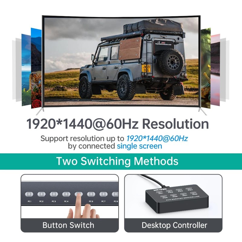 - 2 switching options: 1: desktop switch: with 2M wire-extended selector, 2: button switching: press the button to select the PC