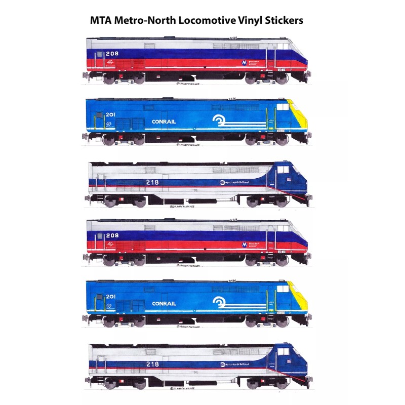 MTA Metro-North Commuter Railroad 2 each P32ACDM 201 Conrail Heritage 40th Anniversary, 208 40th Anniversary, 218 individual Stickers by Andy Fletcher.  Stickers are reproductions of MTA Metro-North P32ACDMs 201 Conrail Anniversary, 208 40th Anniversary and 218 drawn by artist Andy Fletcher, designer of the Norfolk Southern Heritage Locomotives.  Stickers are approximately 1.25"x 4"-5".