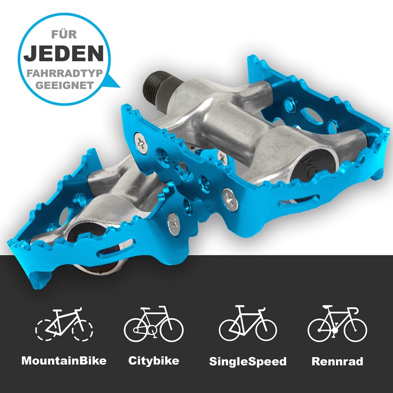 - Sturdy materials: aluminium cage and aluminium body are held together with robust steel screws. Therefore, these bicycle pedals are suitable for MTB bicycles, trekking, city bikes, e-bikes SingleSpeed etc.