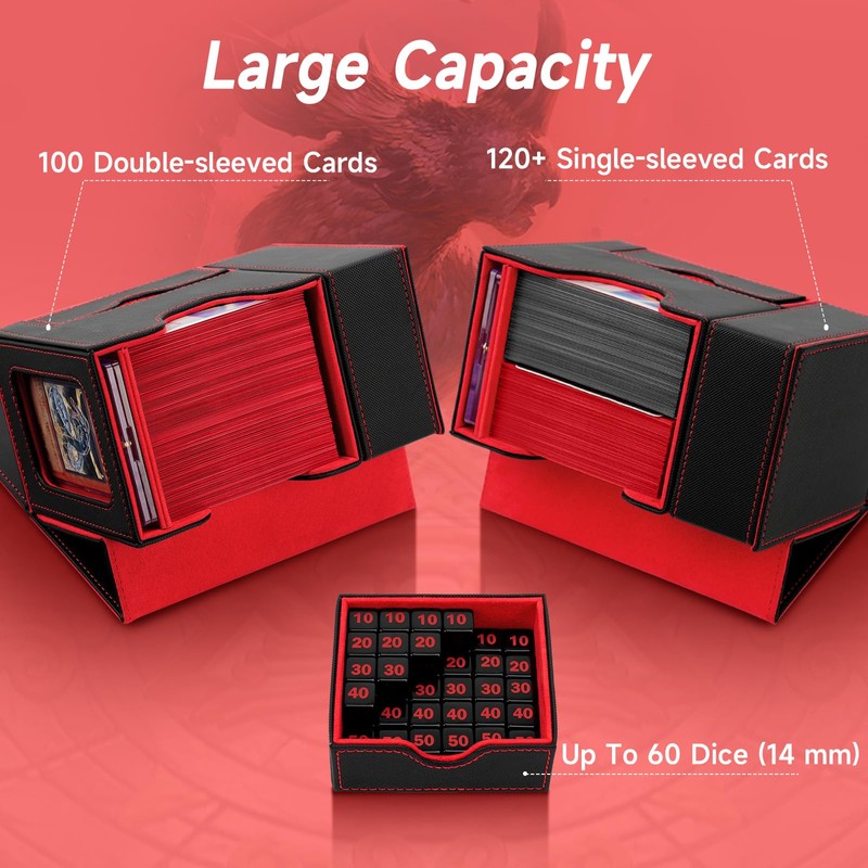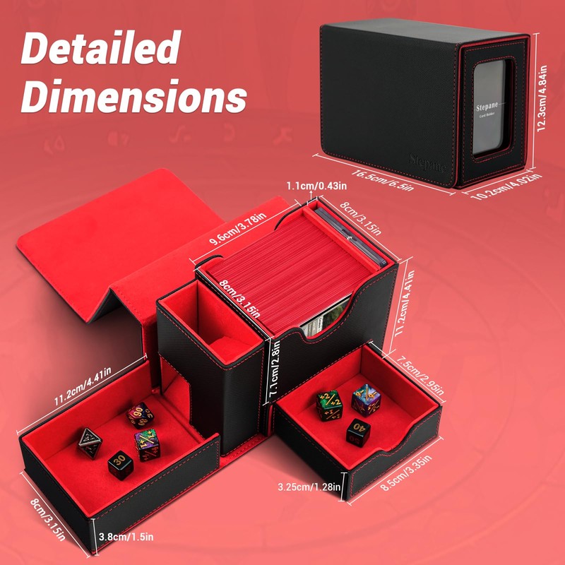• Large Capacity: The Stepane MTG deck box has been tested with a variety of popular sleeves on the market and can hold up to 100 double-sleeved cards or 120 single-sleeved cards; the dice tray holds up to 60 dice (14mm); ensuring that all gaming essentials are neatly organized and within easy reach