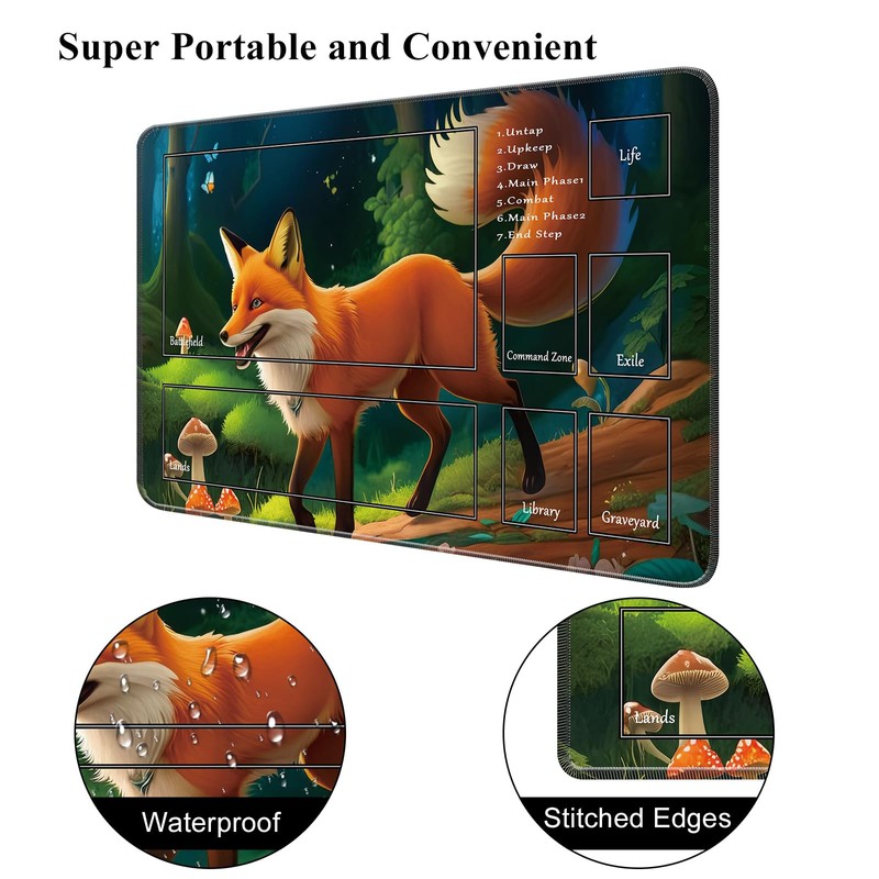 MTG Play Mat, 24 x 14 Inch TCG Card Play Mat Stitched Edges MTG Commander Play Mat 3 mm Thick Waterproof Fox MTG Play Mat with Zones with Storage Bag