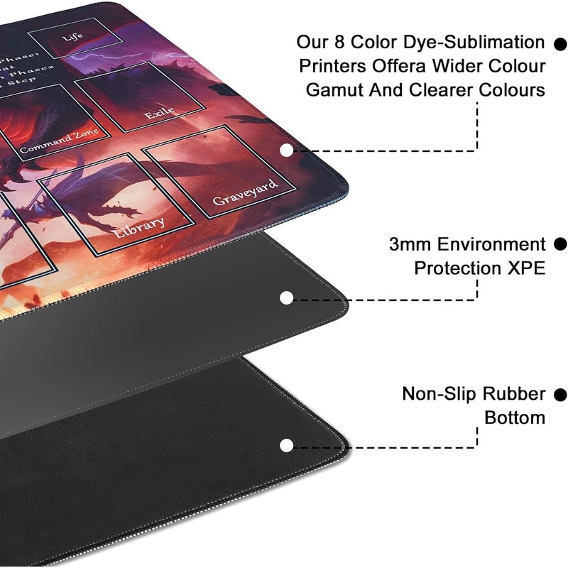 - ZONING This play mat is equipped with clear zoning for different stages of the Magic Carpet Game (MTG). This helps players better organise and manage the different elements of the game.