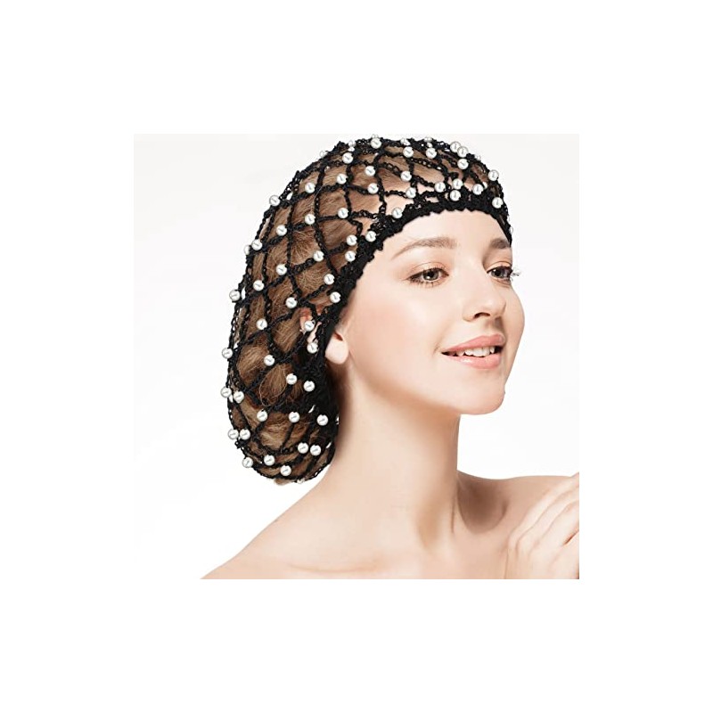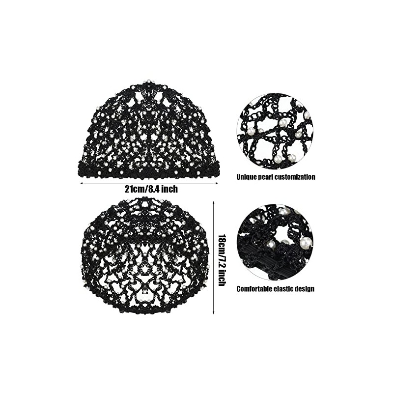 MTLEE 2 Pieces Snoods for Women Hair Mesh Crochet Hair Net with Pearl Rayon Hairnet Hair Wrap Hair Cover Ornament Rayon Knit for Sleeping (Black)