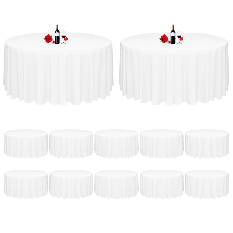 - PREMIUM POLYESTER TABLECLOTH - 12 pack 120 inch round tablecloth white round tablecloth polyester table clothes for wedding, banquets, suitable for round tables, providing various drop(Please refer to the size chart). white round tablecloth 120 inch cloth is designed with premium polyester fabric, more comfortable. Protecting and decorating your table while providing more convenience for your daily use and cleaning.