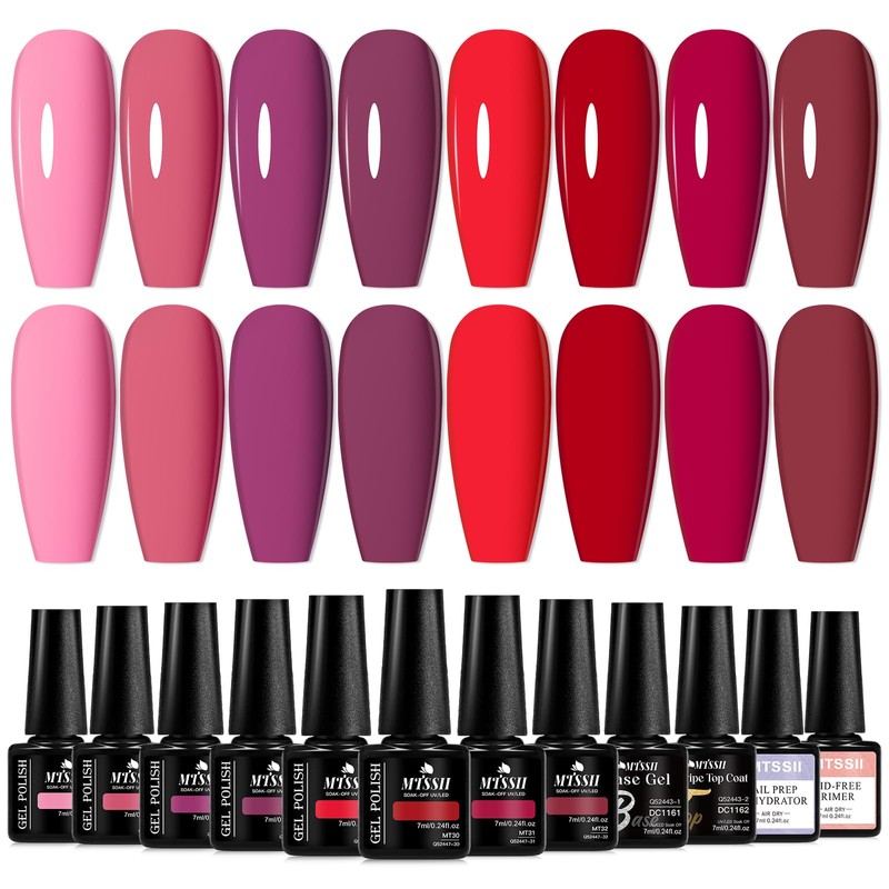 MTSSII Burgundy Red Gel Nail Polish Set for Nails 12 Pcs Including Dark Red Cherry Wine Red Purple Gel Polish with Base Top Coat, Nail Dehydrator and Primer Nail Art Design Decoration DIY Gifts