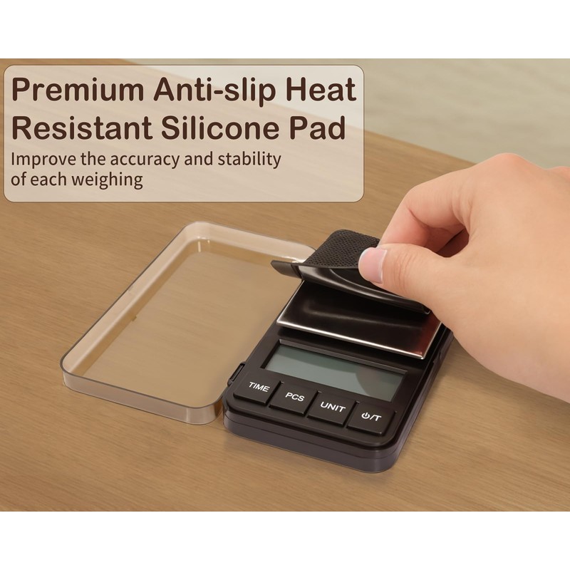 Abnehmbares Silikonpad: Diese digitale grammwaage verfügt über ein abnehmbares Silikonpad zum Schutz der Oberfläche. Es ist wasserdicht, rutschfest, kratzfest und wärmeisolierend.